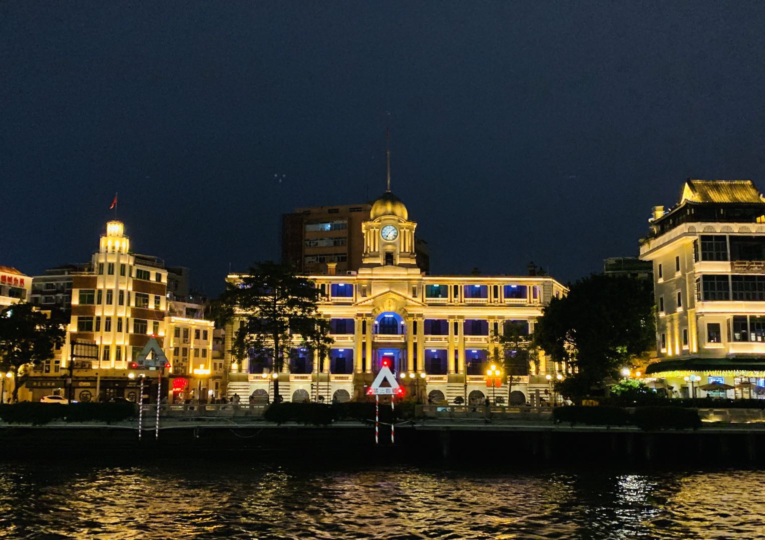 塔影楼上星光点点,西堤码头造型简约,粤海关、邮政博物馆、南方大厦的的轮廓在灯光的映衬下,让西堤沿岸有了“小外滩”的风韵。