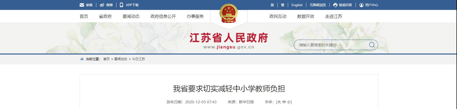 日前,江苏省委办公厅、省政府办公厅联合印发《关于切实减轻中小学教师负担进一步营造教育教学良好环境的通知》(以下简称《通知》),要求严格清理规范与中小学教育教学无关事项,切实减轻中小学教师负担。