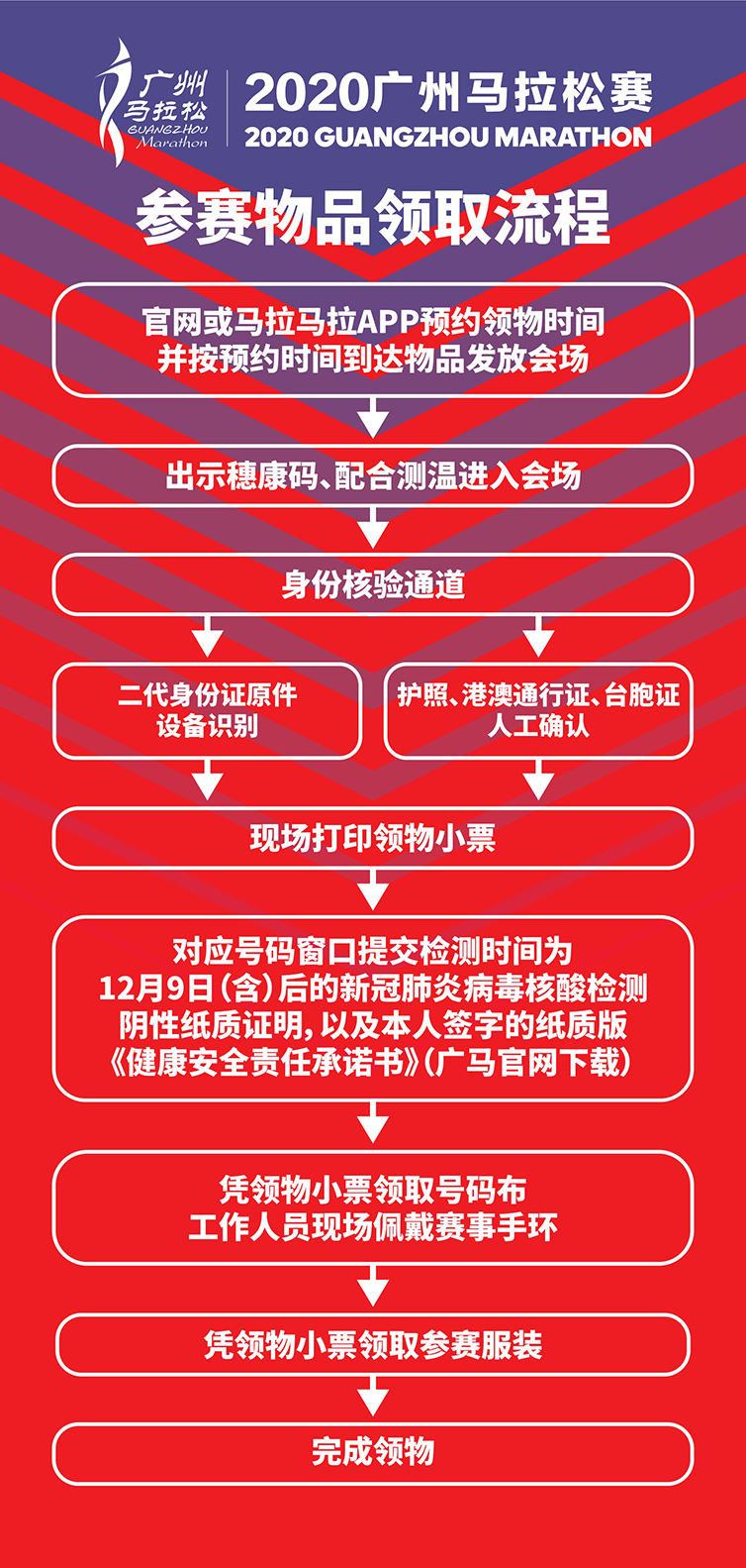 1、参赛选手领取参赛物资及号码布时,须本人出示穗康码(绿码状态,且其绑定证件号与报名证件号一致),并测温通过后进入领物现场。领物时,须本人出示报名所用的有效证件原件,并提交:
