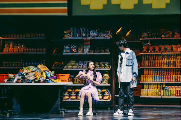 444号便利店是网剧《灵魂摆渡》的重要地点。而这家看似普通的便利店,实则是“灵魂摆渡人”的工作间,亦灵魂在人世间的最后一站。在剧中这间便利店以一个上下两层的镜面装置呈现在舞台上,带来冲突和对撞、阴阳与虚幻的沉浸式体验。不少原剧粉在结束后走到看板前跟这家著名便利店合影留念。“看到这个便利店有种梦想成真的感觉,之前隔着屏幕幻想它有一天会出现在街角,在这部音乐剧里成了真。”舞台上流动着的表演,和“固定”的舞台视觉设计为观众们打开现实和虚幻的边界,构建出剧中的魔幻世界。