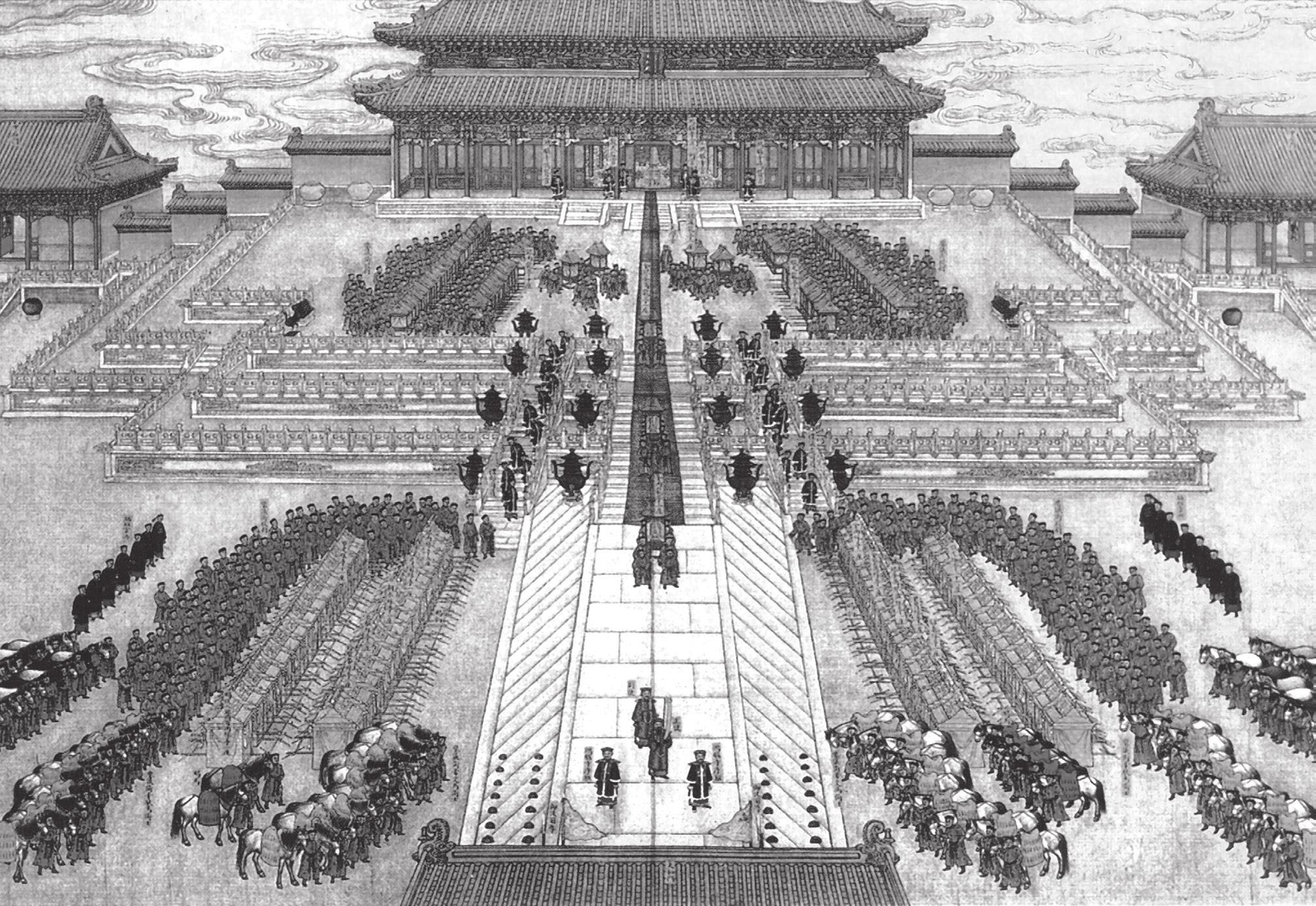 插图翻拍:光绪皇帝婚礼场面,由清代宫廷画家以连环画的形式记录下来。此图便为《大婚典礼全图册》之《大征礼》。