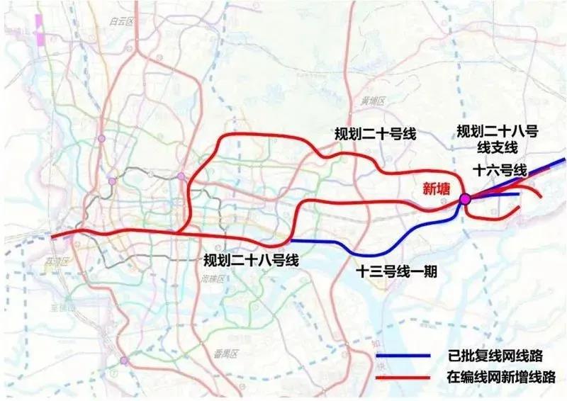 地铁28号线支线线路起于新塘,向东延伸至惠州城区,搭建广州与佛山、东莞及惠州的快速通道,支持粤港澳大湾区战略规划,强化广州对外辐射引导作用,兼有“交通疏解性”和“规划引导性”的特点。线路全长约48千米。采用8节编组最高行车速度160千米/小时市域列车。