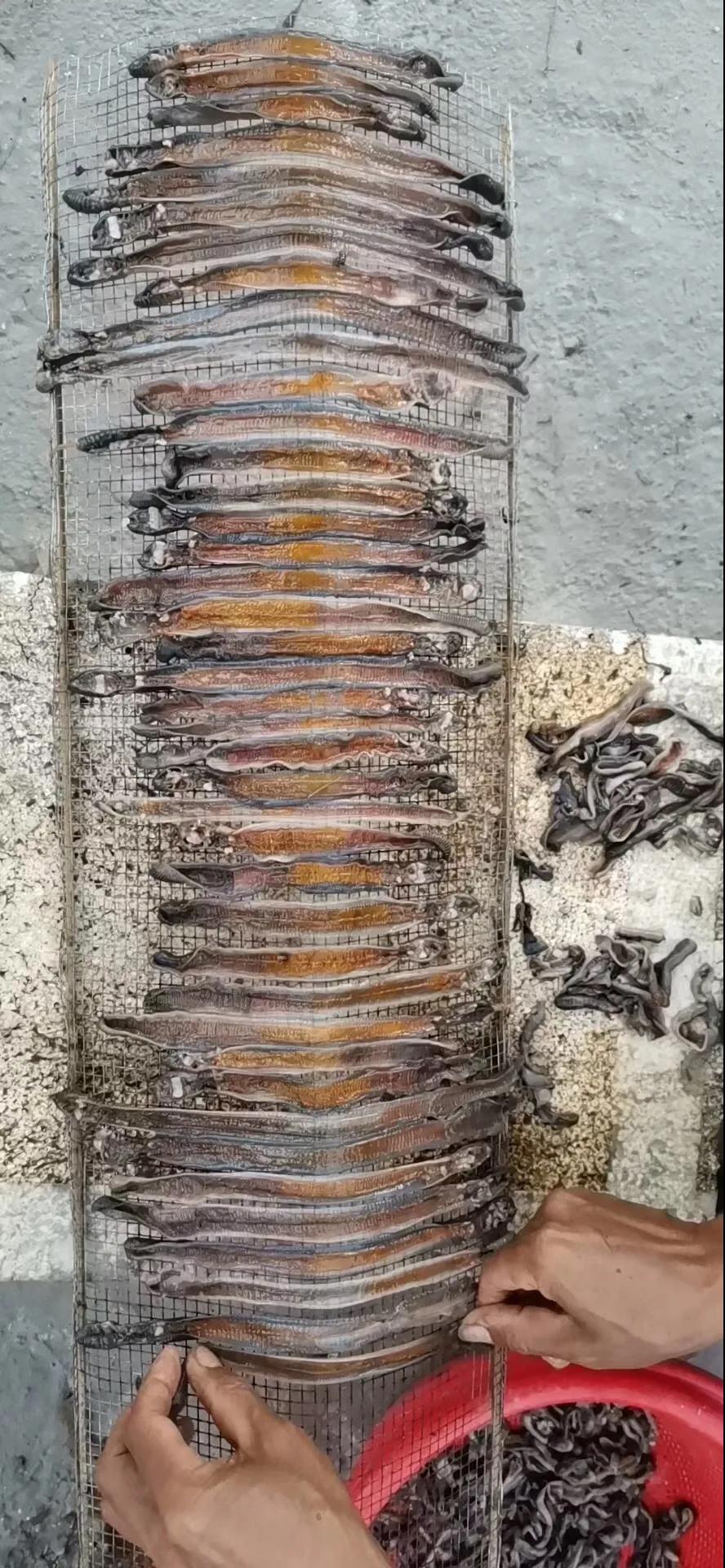 村民们挑选肥大的蚯蚓用河水清洗干净,逐条清理剖开后排列好晾晒风干,几天后一条条药用价值极高的地龙干就完成啦。