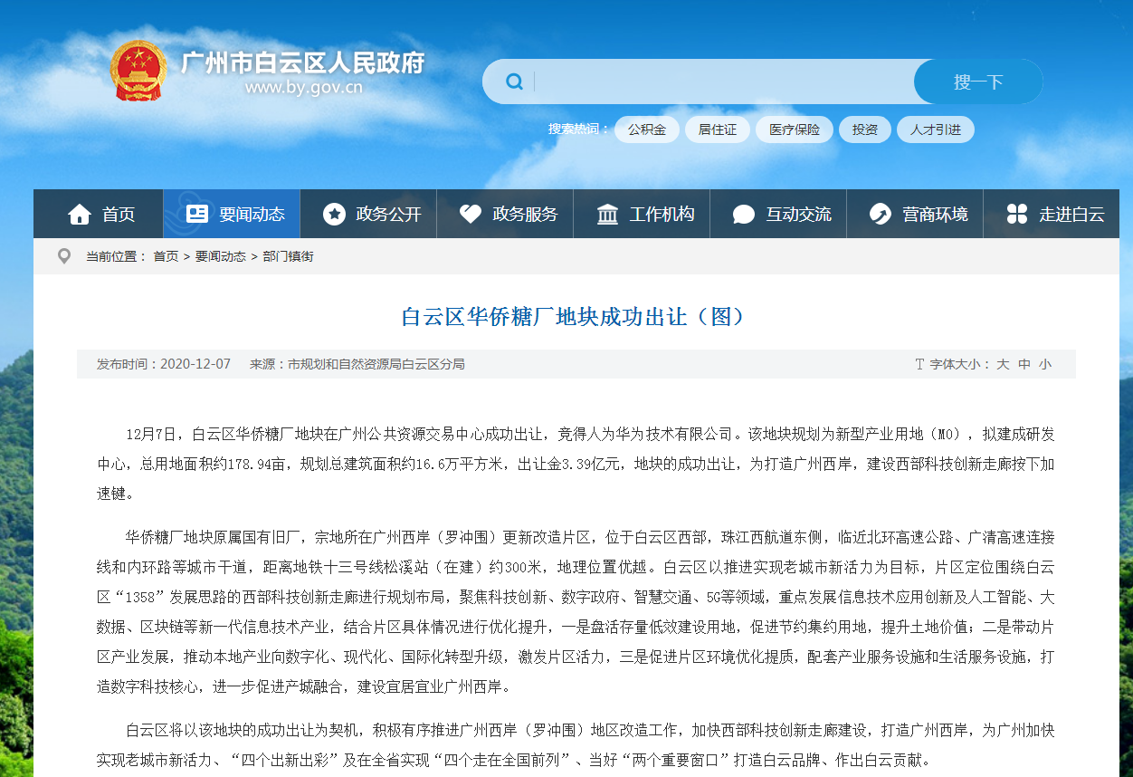 根据广州市白云区政府发布消息显示,12月7日,白云区华侨糖厂地块在广州公共资源交易中心成功出让,竞得人为华为技术有限公司。该地块规划为新型产业用地(M0),拟建成研发中心,总用地面积约178.94亩,规划总建筑面积约16.6万平方米,出让金3.39亿元。同时官网信息称,“地块的成功出让,为打造广州西岸,建设西部科技创新走廊按下加速键”。