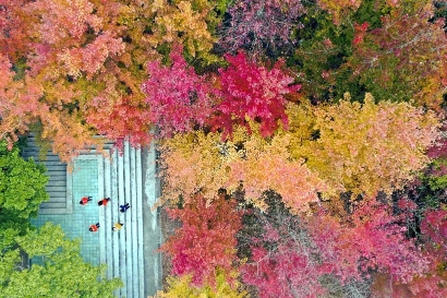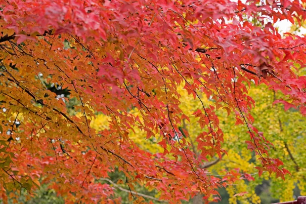 此时的枫树即使是同一品种,甚至同一株树,因为所处位置不同,受到的光照各异,也会呈现出不同的颜色。有的已经满身红叶,纯粹、热烈;有的却是金黄色,还有的半黄半红。深浅不一的红与绿,间或一片微黄浅红,显得别样妩媚。