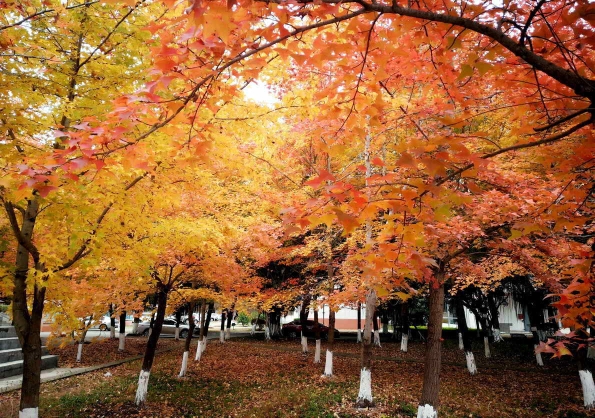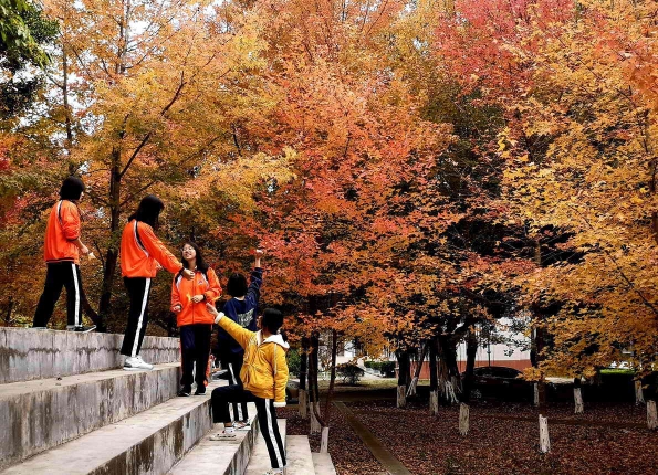 走进校园的西边,远远地就能见到一片耀眼的红色,那就是校园的一片枫树林。在这片并不大的林子里,特别修建了有石阶小道,一排排枫树错落有致的生长着。