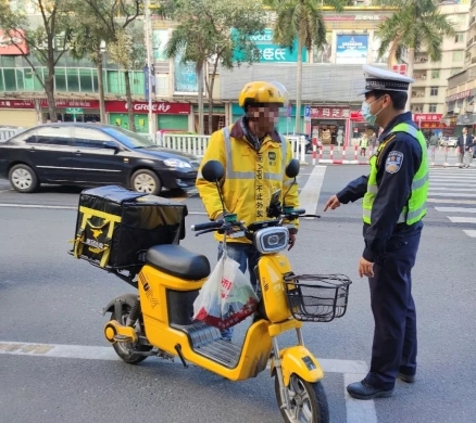 “你开的是电动车,要走非机动车道。”一位正在送外卖的骑手驾驶电动车上了机动车道,站岗的交警立马把他请到路边,对他进行批评教育,并依法处以50元的罚款。“忘记”佩戴安全头盔、超载搭人、逆向行驶……这些行为贪图了一时便利,却带来了极大的安全隐患。执法交警对违规市民一一进行了批评教育,并依法处罚。