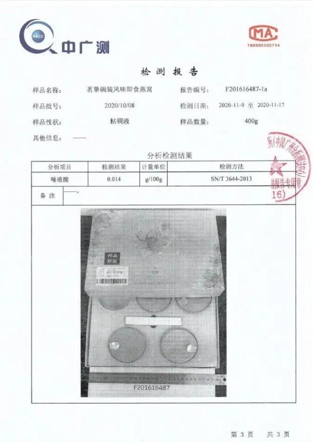王海随即又公开一张检测报告,表示该燕窝中唾液酸只含0.014g。根据市场上唾液酸的价格推算,该燕窝成本不足1元。