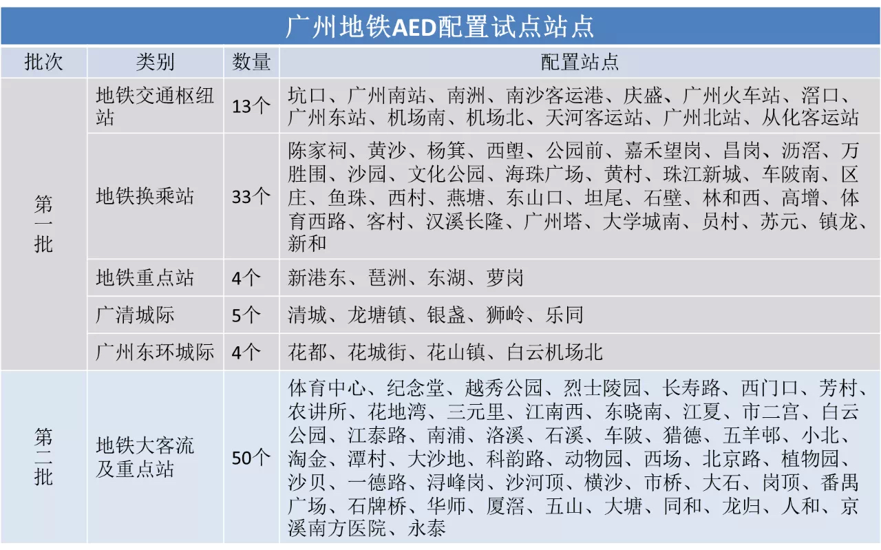 为进一步健全广州地铁应急救护机制,在市卫健委的指导部署,市红十字会、广州悦尔公益基金会等社会公益团体的大力支持下,广州地铁集团将于12月18日起,在地铁线网交通枢纽站、换乘站等100座车站,及所运营的广清城际、广州东环城际9座车站分两批开展AED(自动体外除颤器)配置试点工作。