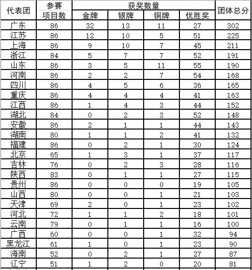14日,记者从中华人民共和国第一届职业技能大赛赛后发布会上获悉,经过3天的激烈角逐,大赛累计共有1350人获得相关奖项,其中291名选手获得86个项目的金、银、铜牌,1010名选手获得优胜奖。广东代表团获得32金、13银、11铜,和27个优胜奖,独占鳌头。