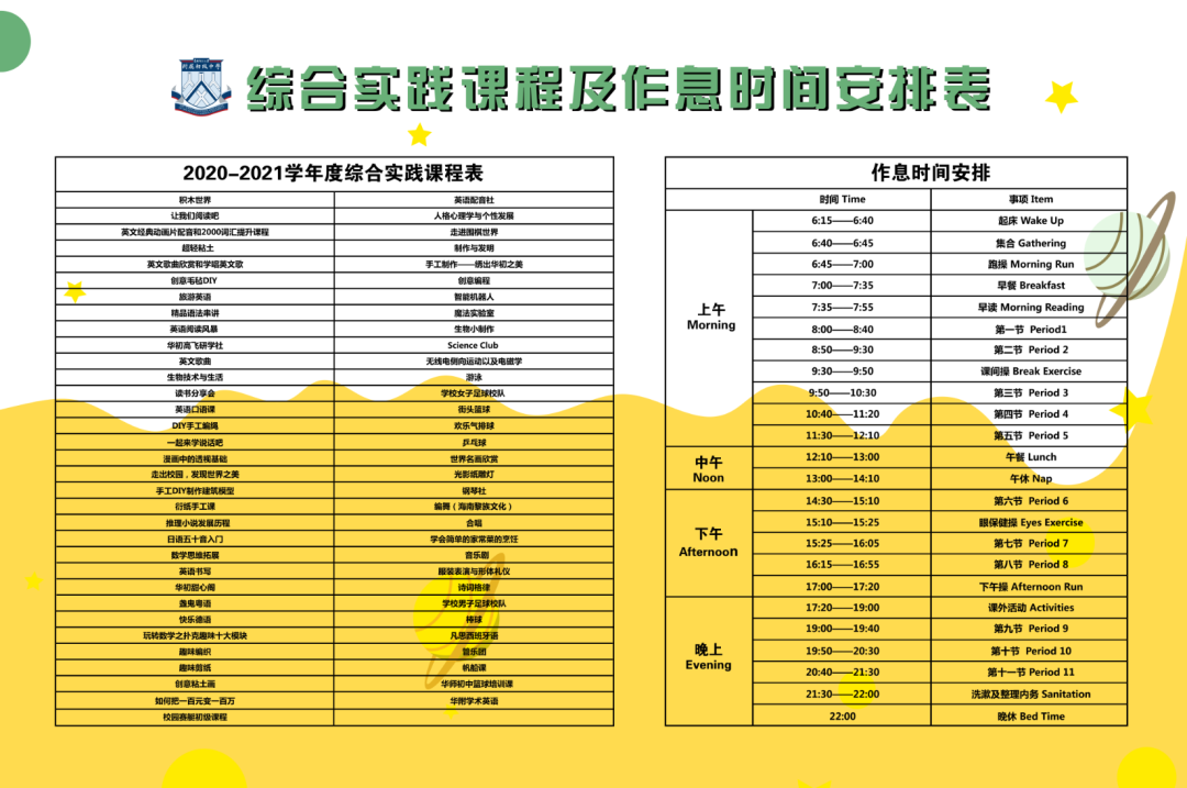 为实现学生“多元发展”的目标,华初根据初中学生的成长规律,开设了帆船课、创意编程课、英语戏剧课、西班牙语课等65种校本课程;在老师的指导下,学生自主成功地创立了文学社、帆船社、英语戏剧社、广播站、吉他社、舞蹈队、管弦乐队、游泳队、足球队、棒球队、绘画社等六十五个社团。华师初中拒绝让孩子们做“困在教室里的书呆子”,学校每年都会举办四月读书节、五月科技节、十月体育节、十二月艺术节等大型活动,以丰富多彩的活动点亮学生的课余生活。