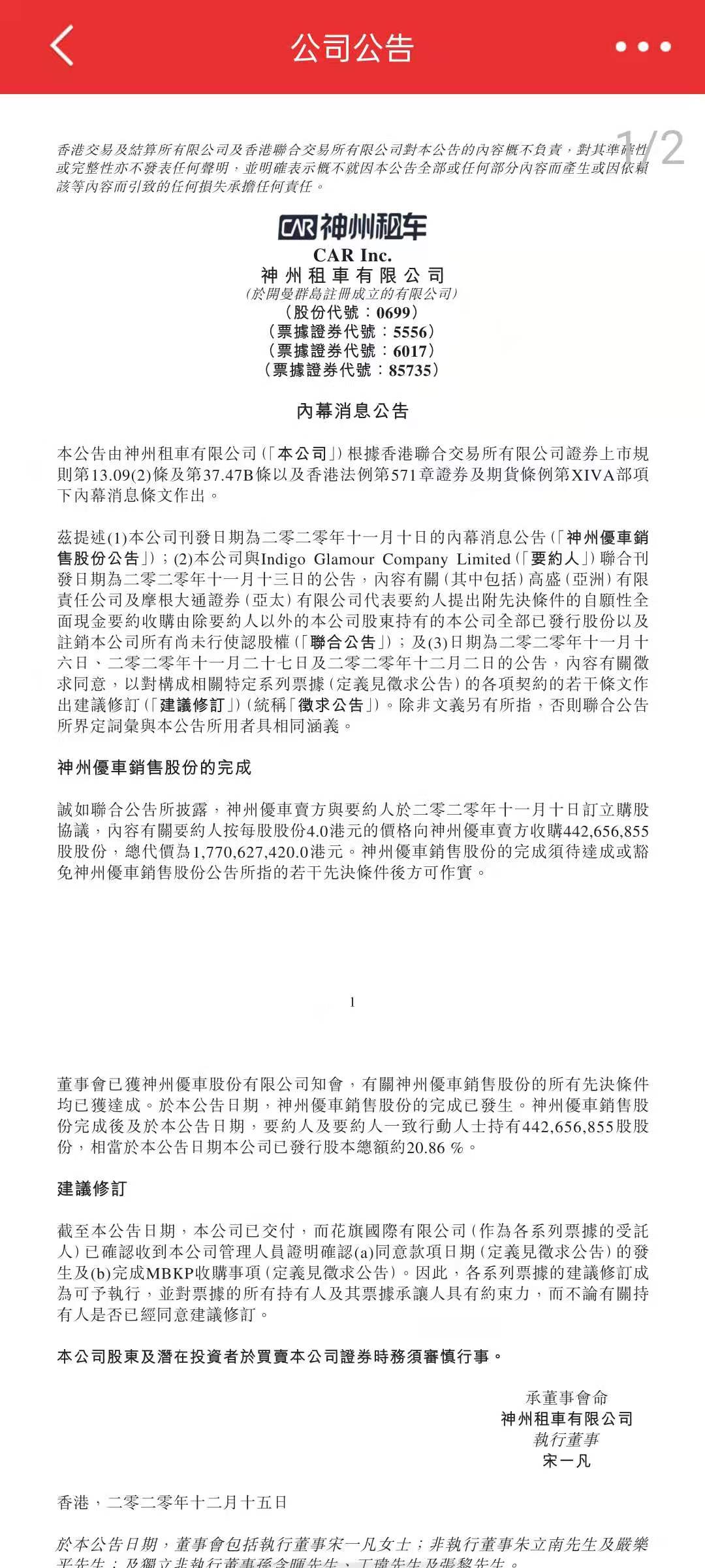 12月15日,神州租车(HK.00699)发布公告,宣布董事会已获神州优车股份有限公司(下称神州优车)知会,有关神州优车销售神州租车股份的所有先决条件均已获达成。收购方安博凯(MBK Partners) 已完成以每股4.0港元,总代价约17.7亿港元的价格收购神州优车所持神州租车股份的交易。交易完成后,安博凯持有神州租车约20.86%的股份,神州优车与神州租车已不再具有股权关系。