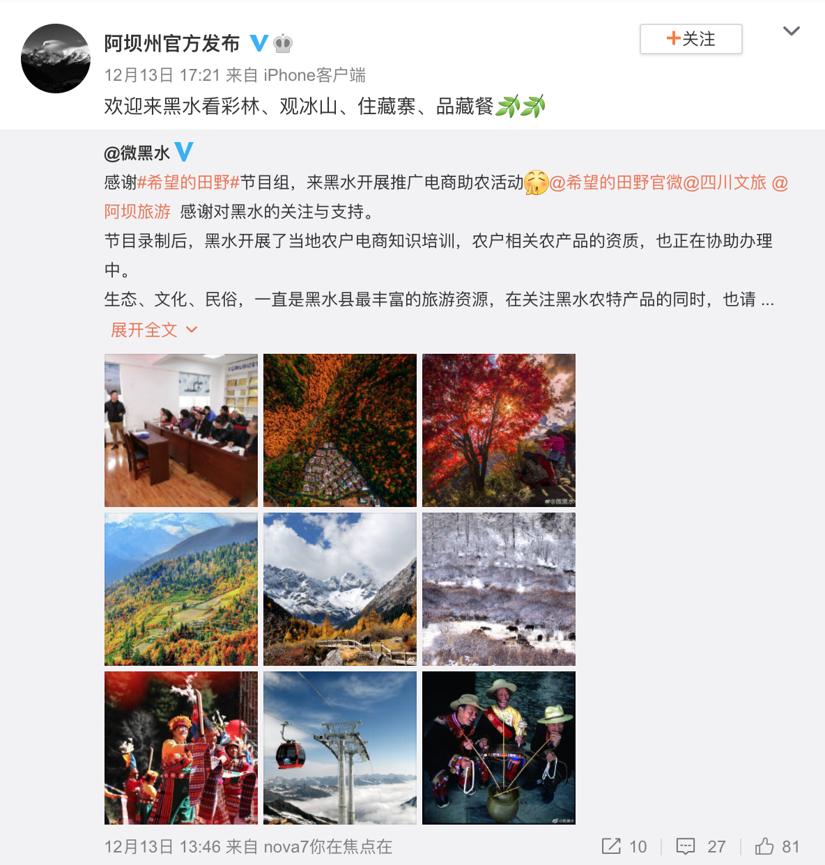 节目播出后,黑水县官方微博“微黑水”发布了一则微博,表示黑水已经开展了当地农户电商知识培训,农户相关农产品的资质也正在协助办理中。黑水县木都村第一书记杨帆说,为了拓宽当地产品的销路,特别是解决生鲜类产品的运输问题,村里把所有能开支的经费全部用在了修路上。