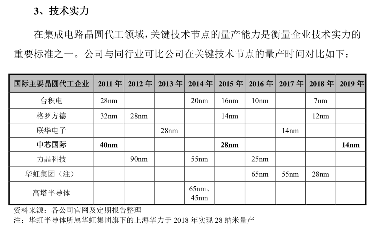 在芯片制程工艺上,与目前一些全球竞争对手相比,中芯国际仍有不少距离。据中芯国际在招股书中称,在集成电路晶圆代工领域,关键技术节点的量产能力是衡量企业技术实力的重要标准之一。其中,台积电在2018年已实现了7纳米先进制程技术量产,格罗方德在2018年亦实现了12纳米的先进制程技术量产,而中芯国际在2019年才实现14纳米的先进制程量产。