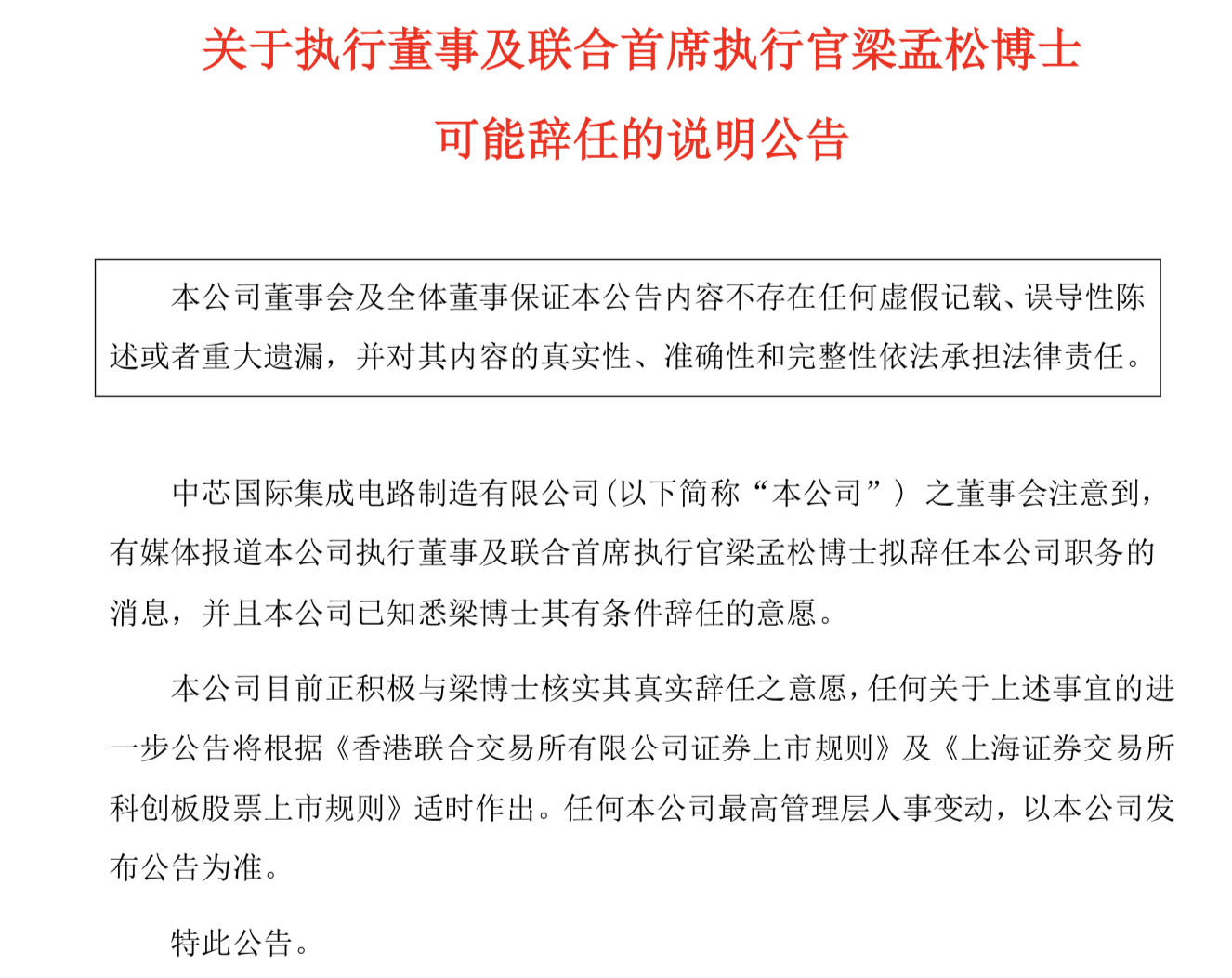 中芯国际16日早上发布公告表示,公司目前正积极与梁博士核实其真实辞任之意愿,任何关于上述事宜的进一步公告将根据《香港联合交易所有限公司证券上市规则》及《上海证券交易所科创板股票上市规则》适时作出。并表示,任何公司最高管理层人事变动,以公司发布公告为准。