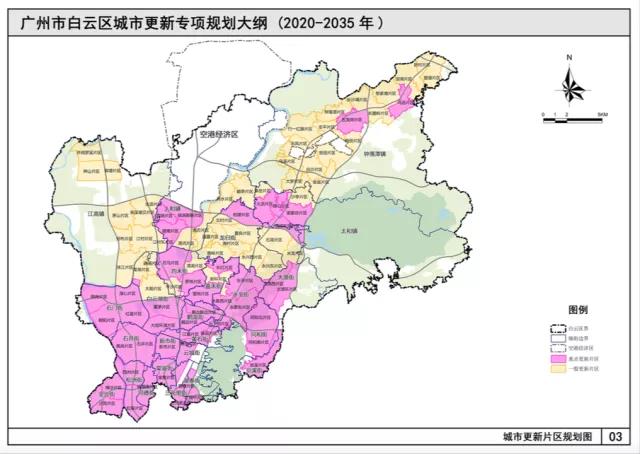 此次更新规划大纲共划定更新片区93个,总面积325平方公里,占白云区(不含空港经济区)总面积约53.5%。其中,近期(2020-2025年)重点更新片区46个,总面积175平方公里;重点片区面积占更新片区总面积的53.8%。