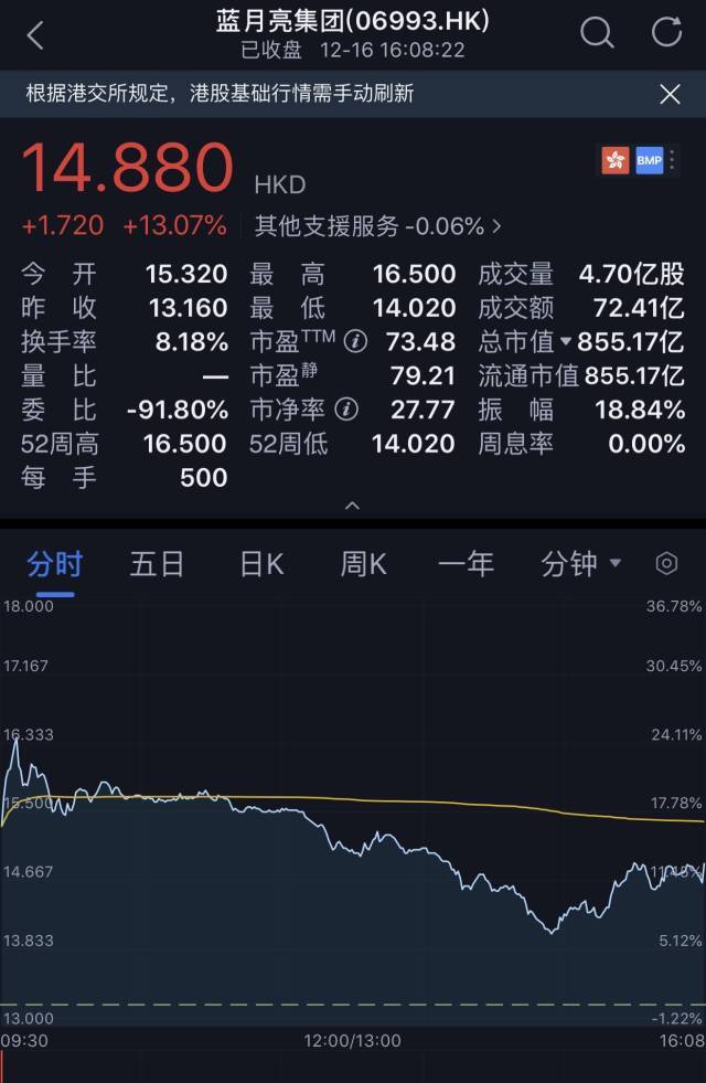 12月16日,中国家庭清洁剂生产品牌蓝月亮集团正式登陆港交所,股票代码06993,开盘后股价即上扬16%,截至16日收盘,涨13.1%,收报14.88港元/股。