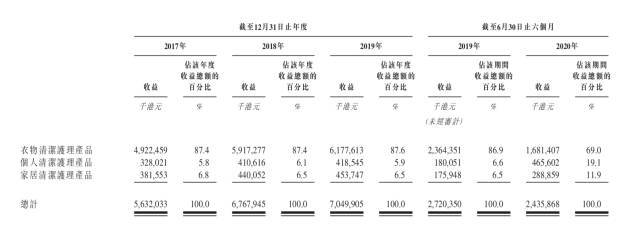 1994年,公司现任首席执行官罗秋平及其父亲罗文贵成立了广州蓝月亮公司。目前,蓝月亮产品涵盖衣物清洁护理、个人清洁护理以及家居清洁护理三大品类。2020年上半年,上述三大品类对于其收益贡献所占的比例分别为69%、19.1%和11.9%。
