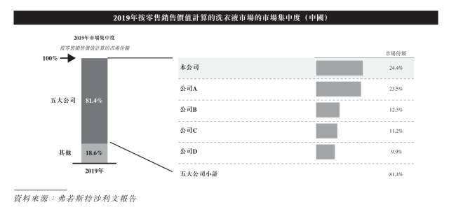 但在成为“中国版宝洁”之前,蓝月亮“老大”地位也在受到后来者的挑战之中。在蓝月亮最擅长的洗衣液市场,根据弗若斯特沙利文报告,2019年按零售销售价值计算的洗衣液市场的中国市场集中度,蓝月亮所占的市场份额为24.4%,而第二名占比为23.5%,蓝月亮仅领先0.9%。