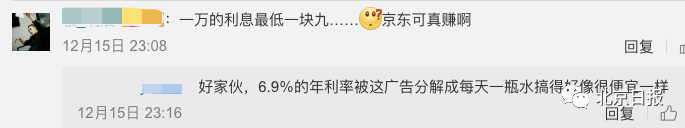 针对该广告,有网友对其中的“万元日息最低1.9元,还没有一瓶水贵。”产生质疑。