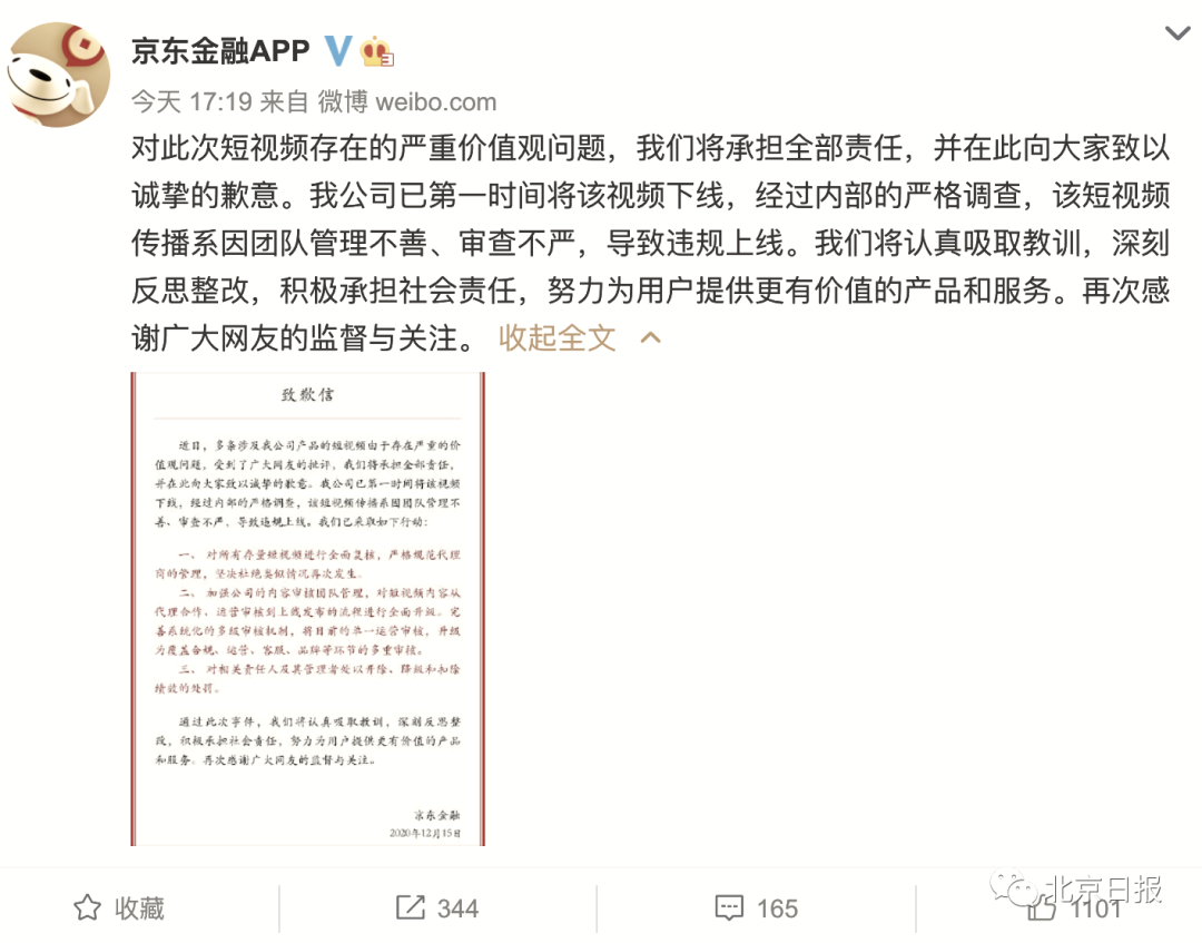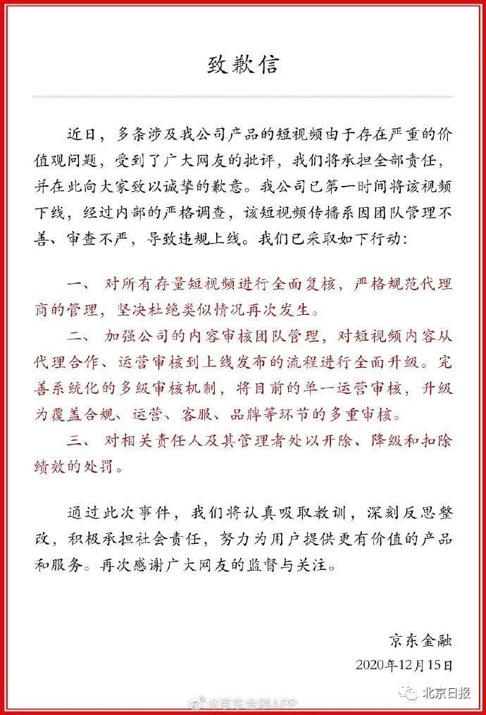 12月15日,@京东金融app 发布致歉信称,近日,多条涉及我公司产品的短视频由于存在严重的价值观问题,受到了广大网友的批评,我们对此将承担全部责任,并在此向大家致以诚挚的歉意。