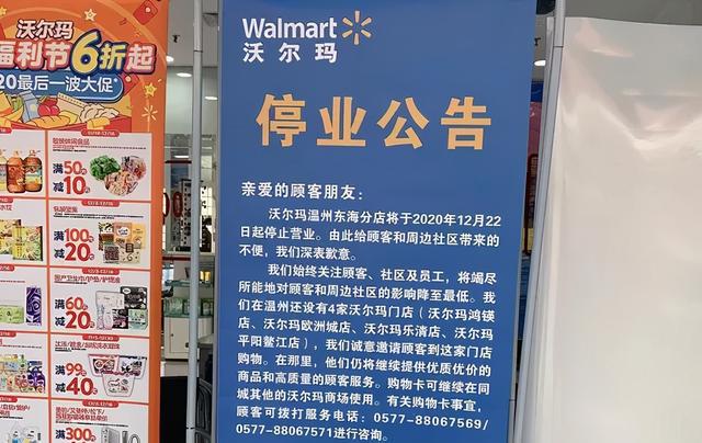 根据沃尔玛温州东海分店公告显示,该店将于2020年12月22日起停止营业,由此给顾客和周边社区带来的不便深表歉意,购物卡可继续在同城其他沃尔玛商场使用,延保服务将不受影响。沃尔玛在温州仅剩4家门店,包括沃尔玛鸿锳店、沃尔玛欧洲城店、沃尔玛乐清店、沃尔玛平阳鳌江店。