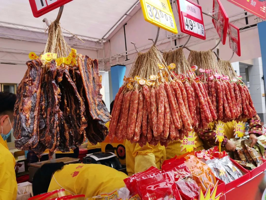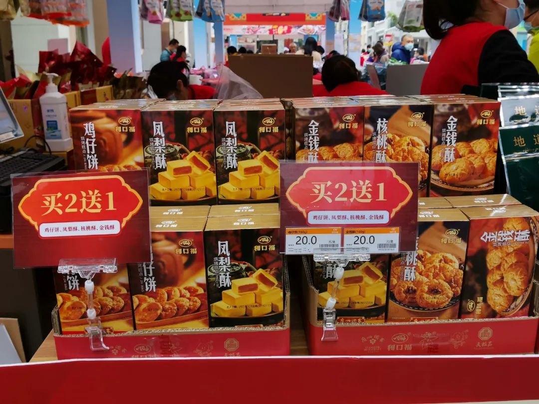 腊肠18元/包,豆豉鲮鱼19.9元/组,汤圆买三送一,水饺买二送一......腊肠腊肉、汤圆水饺、饼酥包点、广式糖酒、休闲零食等广东人冬至、过年必备货品,在岁末尤其应时、应市、应景。