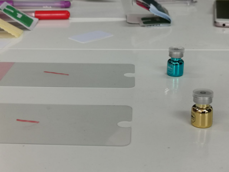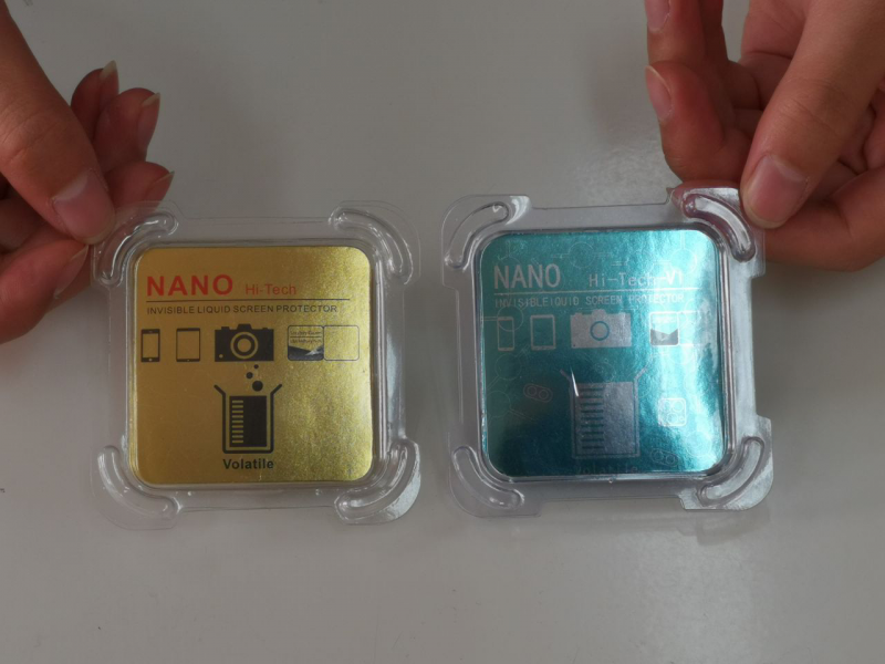 拿到样品之后,记者看到,两瓶纳米膜瓶身颜色不同,瓶高均为两厘米多,内有一些无色透明且没有任何味道的液体。瓶身和一张纸板上有关于产品的说明,写着“9H+”、“invisible liquid screen protector”(液态隐形屏幕保护膜)等英文字样。经过检索,“9H+”是关于硬度的标注。和一般产品需要标注生产厂家、产地、售后服务联系方式等不同的是,记者买到的两瓶纳米膜均没有相关信息。