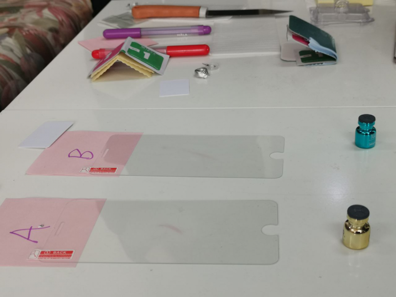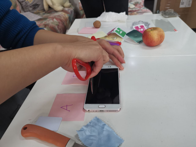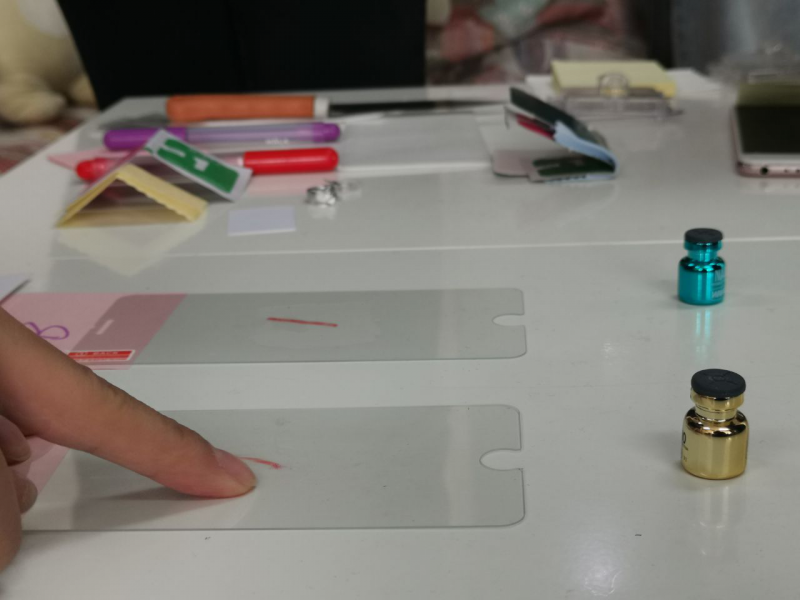 记者对此进行了实验,首先准备好两个钢化膜及两个不同品牌的手机,在均未涂抹纳米膜的前提下,将纸覆盖在两个钢化膜上用水果刀进行切割,纸张均被划破,钢化膜未出现划痕;记者又用水果刀对两个手机屏幕进行切割,手机屏幕也未出现划痕。
