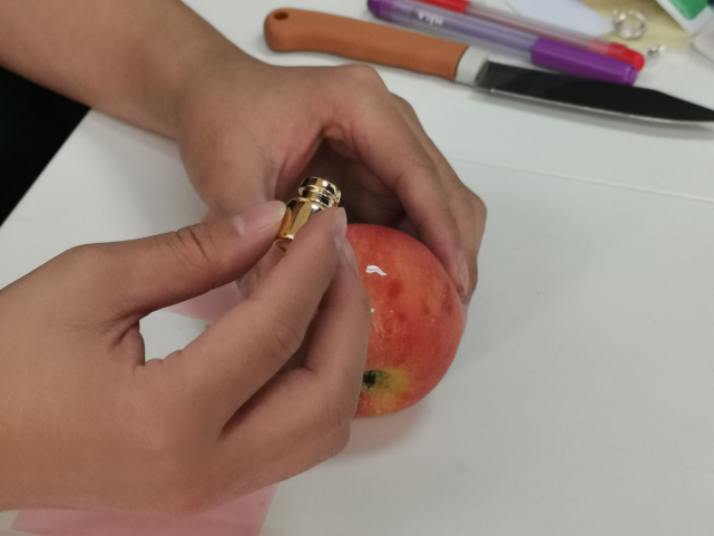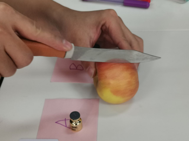 既然纳米膜能够迅速凝固,而且强度很高,记者先后使用手机钢化膜、手机屏幕、苹果等不同的材质进行实验。
