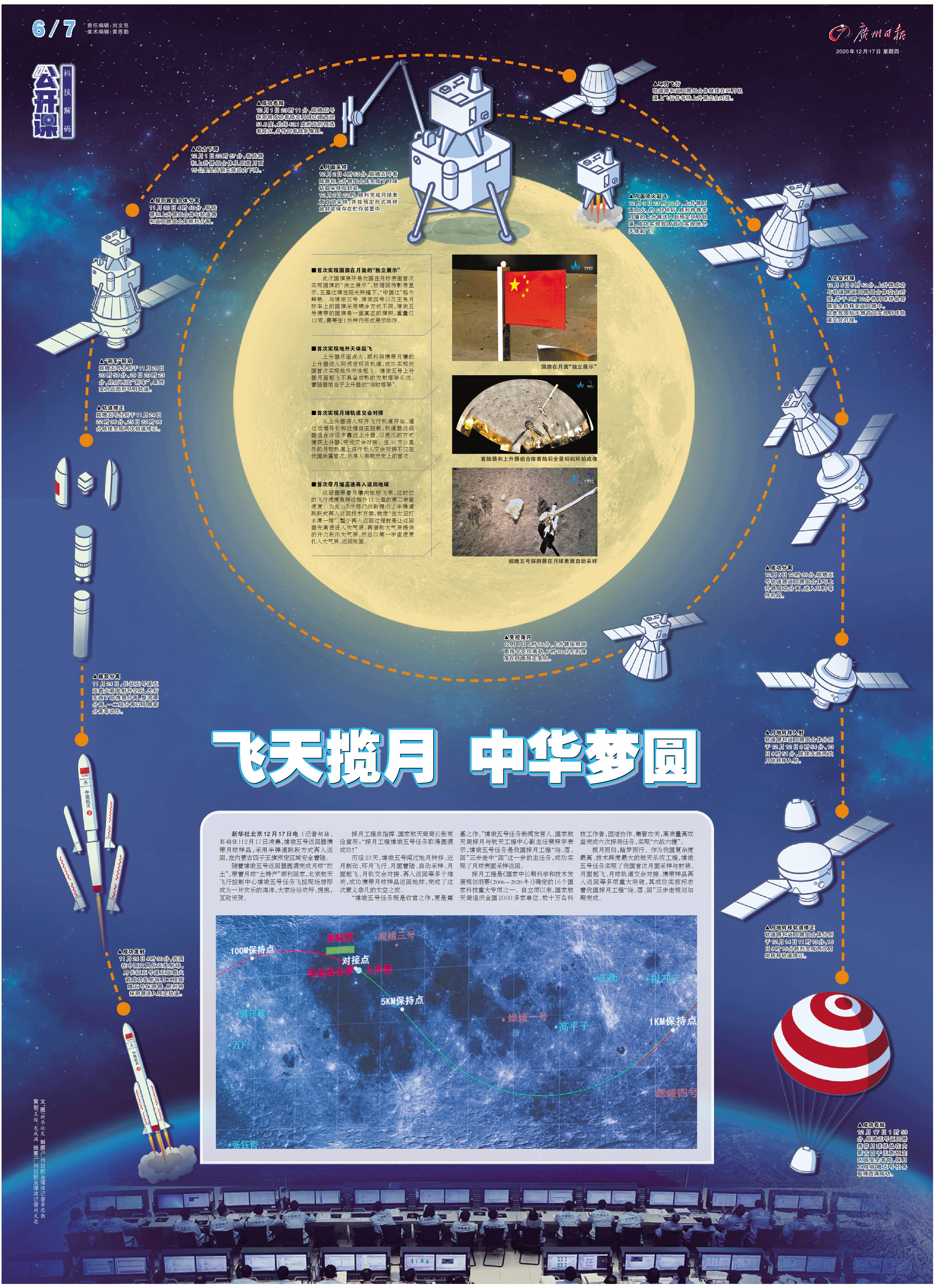 历经23天,嫦娥五号闯过地月转移、近月制动、环月飞行、月面着陆、自动采样、月面起飞、月轨交会对接、再入返回等多个难关,成功携带月球样品返回地球,完成了这次意义非凡的太空之旅。