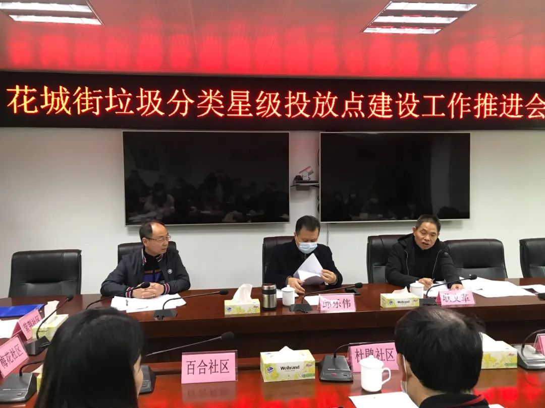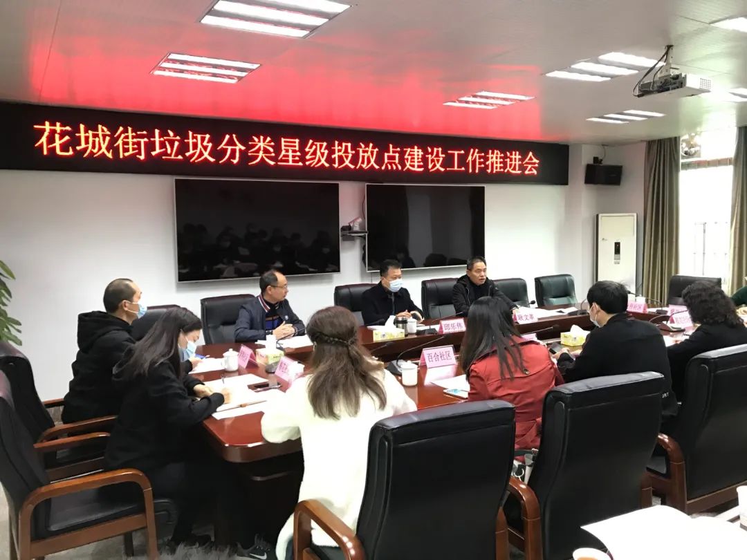 12月14日,花城街召开2020年垃圾分类星级投放点建设工作推进会,创建13个星级生活垃圾投放点。花城街党工委书记邱乐伟,党工委委员、武装部部长耿文革和街道市政管理所、各社区及相关部门负责人参加会议。