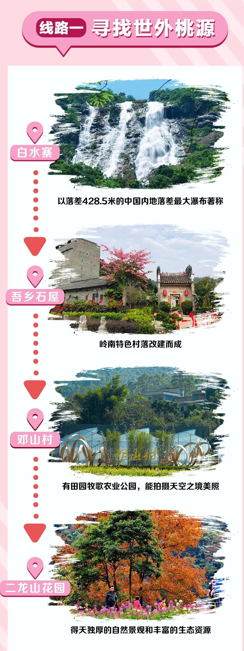 白水寨(以落差428.5米的中国内地落差最大瀑布著称)——吾乡石屋(岭南特色村落改建而成)——邓山村(有田园牧歌农业公园,能拍摄天空之境美照)——二龙山花园(得天独厚的自然景观和丰富的生态资源)
