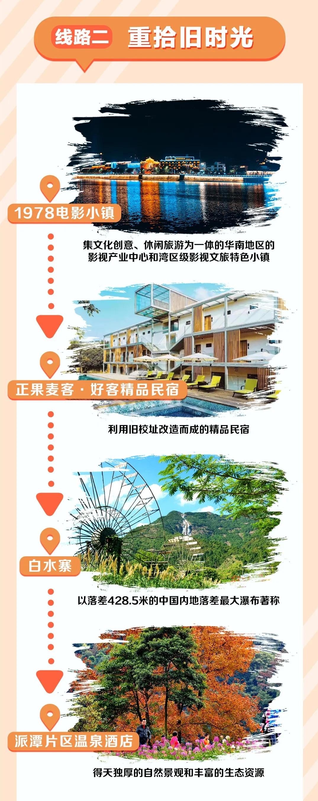 1978电影小镇(集文化创意、休闲旅游为一体的华南地区的影视产业中心和湾区级影视文旅特色小镇)——正果麦客·好客精品民宿(利用旧校址改造而成的精品民宿)——白水寨(以落差428.5米的中国内地落差最大瀑布著称)——派潭片区温泉酒店(多家品牌豪华温泉酒店)