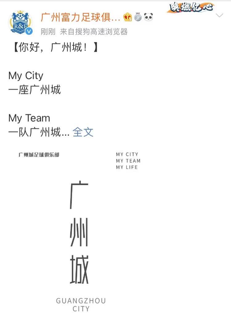 广州富力足球俱乐部官方账号发布了“广州城”的海报图片,并写道:“你好,广州城! My City,一座广州城;My Team,一队广州城;My Life,一生广州城。”