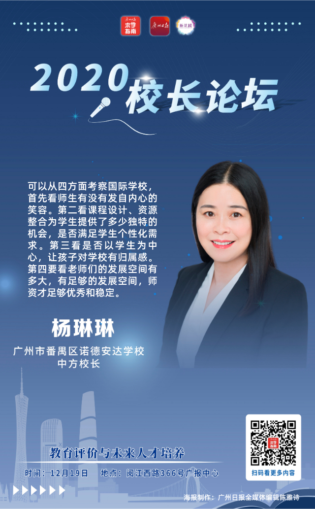 广州市番禺区诺德安达学校中方校长杨琳琳建议,可以从四方面考察国际学校,首先看师生有没有发自内心的笑容。第二看课程设计、资源整合为学生提供了多少独特的机会,是否满足学生个性化需求。第三看是否以学生为中心,让孩子对学校有归属感。第四要看老师们的发展空间有多大,有足够的发展空间,师资才足够优秀和稳定。