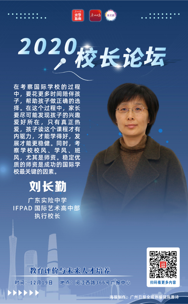 广东实验中学IFPAD国际艺术高中部执行校长刘长勤表示,在考察国际学校的过程中,家长要花更多时间陪伴孩子,帮助孩子做正确的选择。在这个过程中,家长要尽可能发现孩子的兴趣爱好所在,只有真正热爱,孩子读这个课程才有内驱力,才能学得好,发展才能更稳健。同时,考察学校校风、学风、班风,尤其是师资。稳定优质的师资是成功的国际学校最关键的因素。