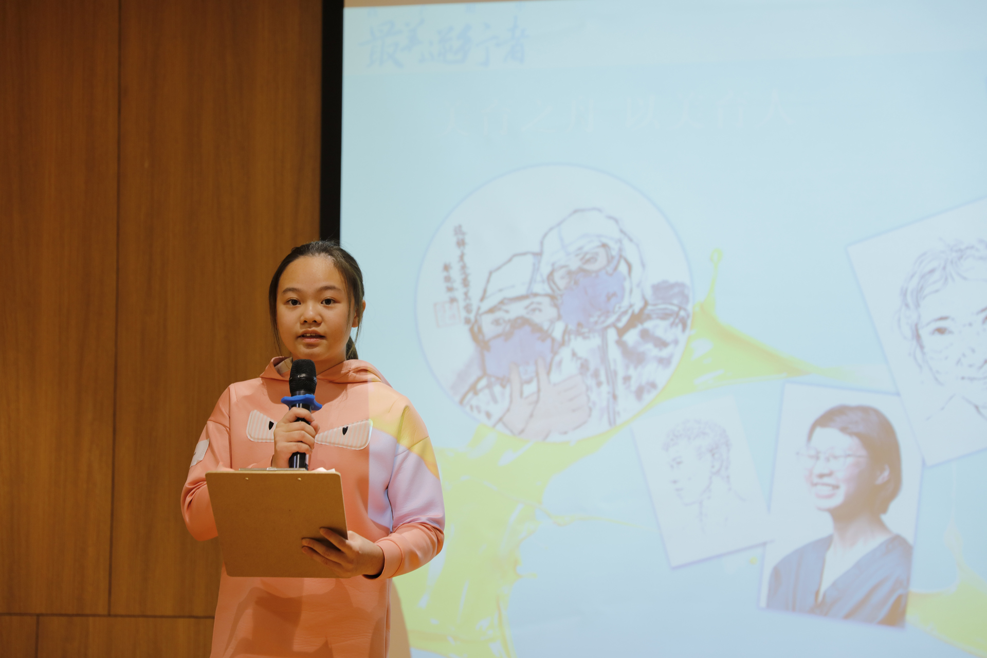 其后,获奖指导老师上台分享了“最美逆行者”创作的心得和体会,伍雄贤老师说道:作为一名教育工作者,这是一次非常有意义的生命教育课程,能够引导学生延伸出有关生命教育、意志力以及心理健康等方面的探讨。获奖学生代表蔡苑莉也为大家分享了其作品的创作过程。