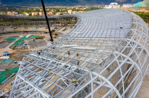 在清远奥体中心施工现场,远望去,已完成钢结构施工的体育场被上万根巨大的钢管错落有致地包裹着,酷似巨大“鸟巢”。在体育场的内部和外围,脚手架密密围了一圈。“这是为了接下来安装幕墙和室内机电而准备的”,保利华南实业有限公司粤北区域清远奥体项目部总经理戴赟伟介绍,按照目前施工进度,奥体中心体育场在明年底可以完整呈现在市民面前。