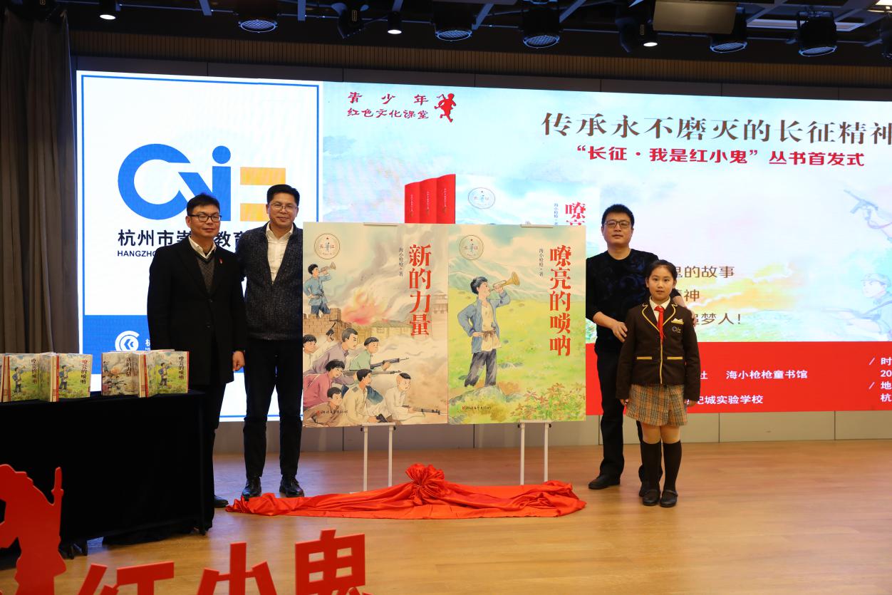 (右起)小说家海飞、浙江文艺出版社副总编辑邱建国、杭州崇文世纪城实验学校校长谭鹏飞共同为“长征·我是红小鬼”系列新书揭幕