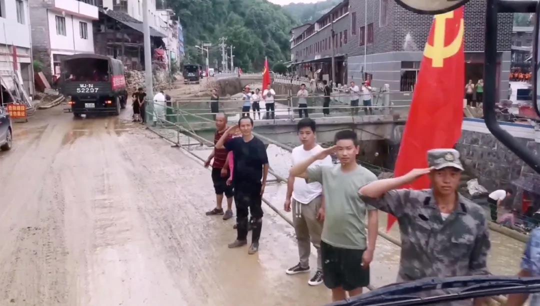 武警贵州总队遵义支队的官兵完成在正安县碧峰镇为期3天的抗洪抢险工作后返回营地。当地群众分立道路两旁,敬礼、挥手,欢送子弟兵离开。