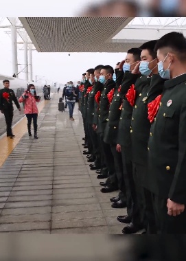 在G571列车上,一名素不相识的军嫂为第82集团军某特战旅退伍老兵们悄悄地买了32份盒饭。短短4分钟的靠站时间,老兵们快速在站台列队,向这名在背后默默付出的军嫂致敬。