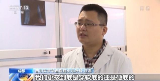 四川大学华西医院小儿外科 江君:很多家长也问我们,我们小孩到底是穿软底的还是硬底的,实际上根据我们的经验像我们的矫正鞋垫都是硬底的,为什么?它要给脚一个有利的支撑,尤其是内侧,那么软底的起不到任何的作用,如果这个小孩穿正常的鞋到底是软底还是硬底好?我个人觉得可能硬底要好一点。