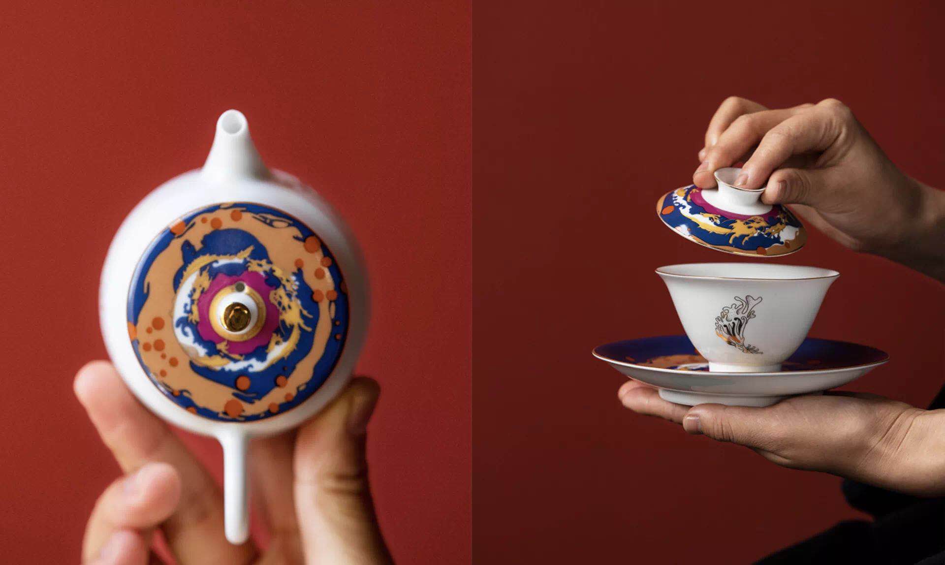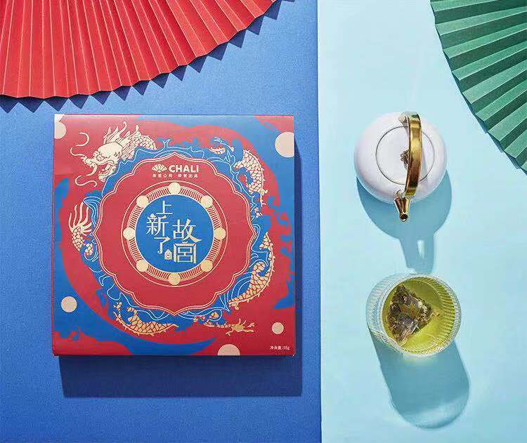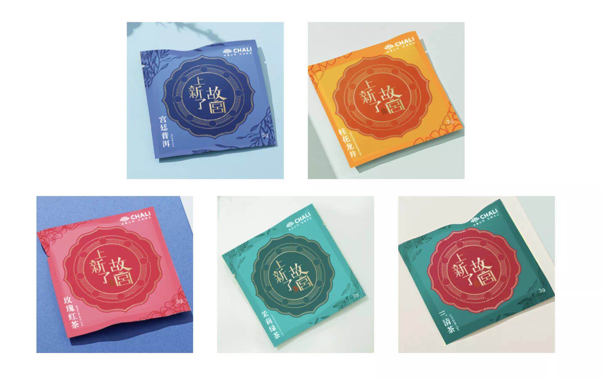 据介绍,“潮•韵”的主视觉效果来自于团队对贡茶、三清茶以及奶茶的融合设计表达。整体纹样蕴涵着两种观察的视角。第一种视角是从中心“向上看”,从庭院、天井、天空,看到是历史的漩涡。第二种视角是从四周“向下看”,模拟俯视的角度,不仅像人们在喝茶水时还没有平静下来的漩涡,又像一只眼睛见证着茶文化的发展历程。整体配色上,团队采用蓝、红、黄的撞色搭配,还原故宫给人的色彩感受。从整体上展现玩转时尚的主题,以及传播茶文化的内涵。