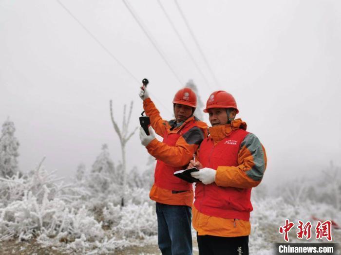 ↑12月15日,国网娄底输电检修公司员工巡视110千伏岳龙杨线,并监测线路覆冰情况,确保线路设备安全稳定运行。 李铭明 摄