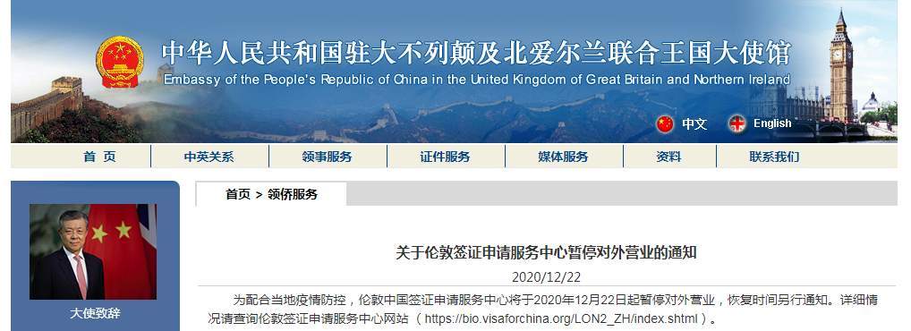 中国驻英国大使馆网站12月22日消息,为配合当地疫情防控,伦敦中国签证申请服务中心将于2020年12月22日起暂停对外营业,恢复时间另行通知。详细情况请查询伦敦签证申请服务中心网站(https://bio.visaforchina.org/LON2_ZH/index.shtml)。