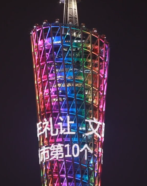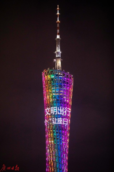 2020年12月22日是广州市第十个“让座日”。12月22日19时40分,广州塔点亮“十年礼让,文明出行”字样,在羊城高空为广州市第10届“让座日”倾情打call,也为广州市民坚持十年礼让文明行为点赞。