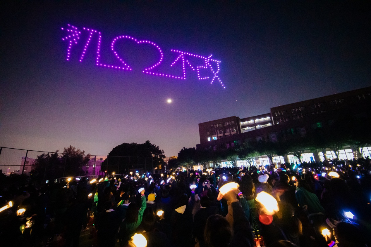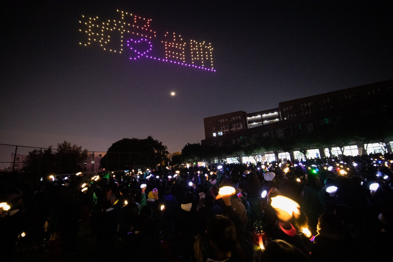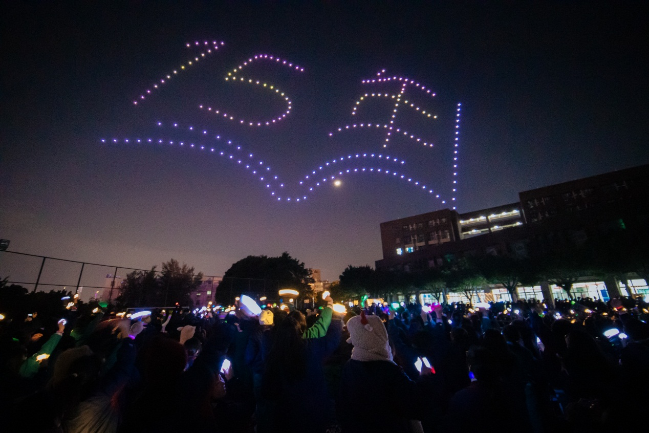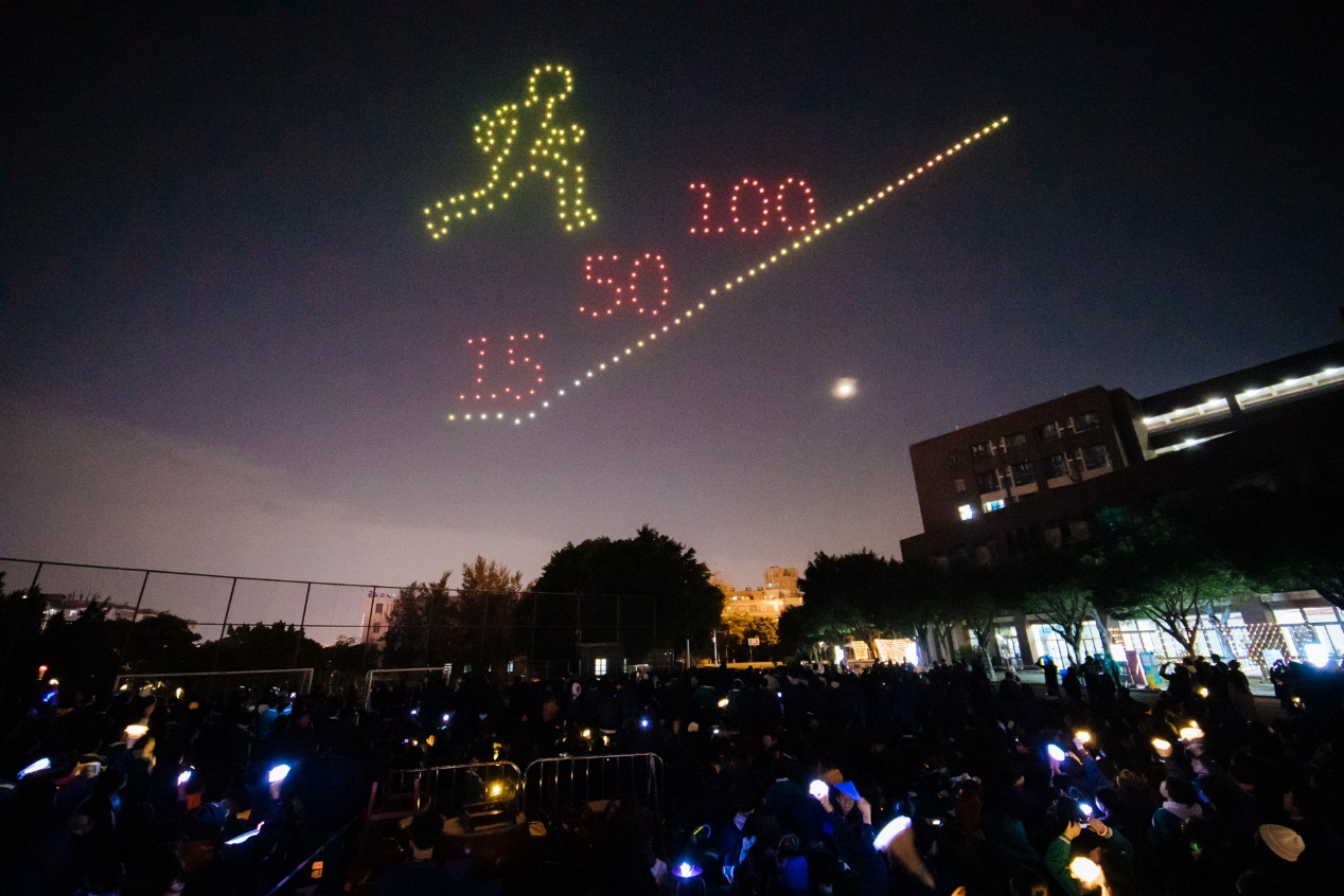 最后,200台无人机缓缓飞上夜空,璀璨如烟花,在田径场上空不停变幻成“生日快乐”“我爱省附”“15年”等形状,这个富有创意、特色和亮点的礼物,让所有人翘首仰望,尖叫和欢呼不绝!大家点燃手中的生日灯,齐声高唱“祝你生日快乐……”把喜庆的气氛引向高潮。