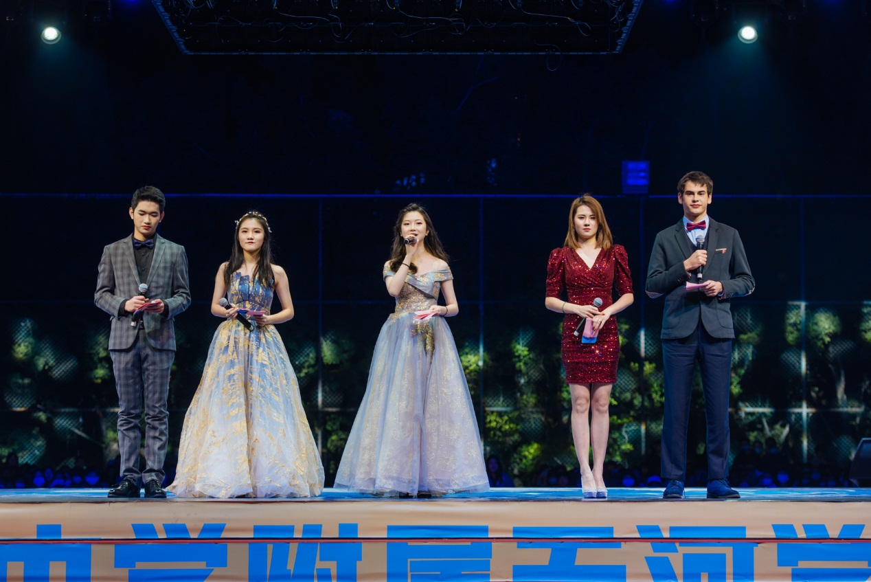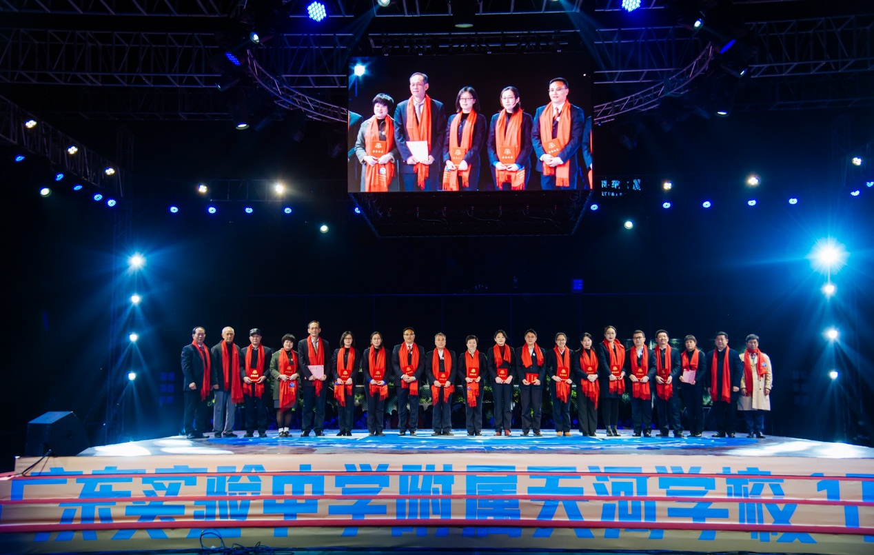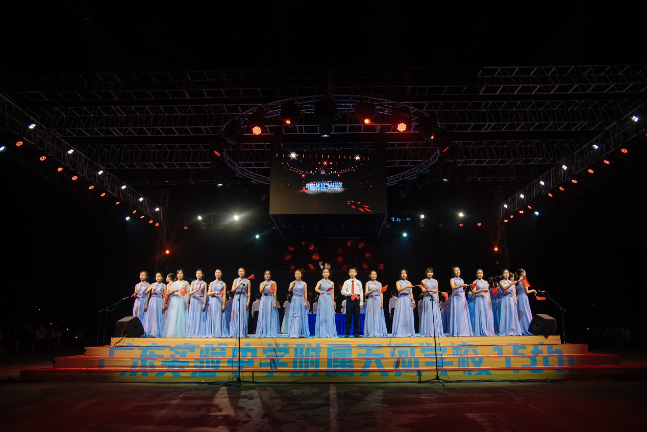 晚上20:00整,文艺晚会正式开始。5位主持人分别用西班牙语、英语、普通话、粤语、汕头话五种语言向大家问好,学校创办人莫道明教授和广东实验中学校长全汉炎先生鸣鼓开场。激情澎湃的中国鼓表演、悠扬婉转的小提琴独奏、温暖有力的学校合唱团大合唱、神秘新奇的管乐团《哈利波特与火焰杯》表演、音乐家方奕带领省附学子双钢琴即兴变奏表演、热情洋溢的街舞、颇有创意的原创歌曲,呈现出一个完美的舞台,燃爆了夜幕下的田径场。而学校合唱团和⼀群活泼可爱的孩子们(教职工子女)一起唱响《我和我的祖国》,更是唱响了省附人的家国情、奋⽃梦。学校还为每一位坚守岗位15年的老师们颁发了创业奖。