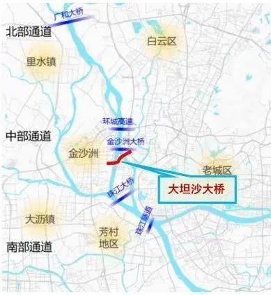 大坦沙大桥东起大坦沙岛,跨珠江水道,西接佛山南海区建设大道,规划为金沙洲地区与广州主城区重要通道,建成后将缓解金沙洲大桥交通压力。